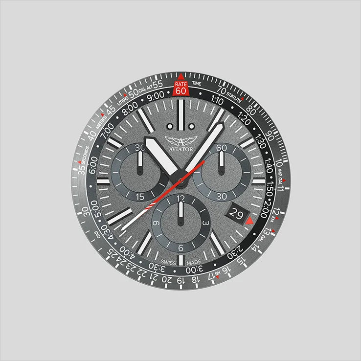 Inspiriert vom Armaturenbrett der MiG-29, mit Multifunktionalität und verschiedenen Anpassungen, ermöglicht Ihnen das Zifferblatt die Anzeige von drei Informationsebenen: Flugschieberegler auf einem drehbaren Reflektor, Zeit und Stoppuhr mit drei Chronographenanzeigen und zentraler Sekundenanzeige. Seine klaren Indizes und markanten Zeiger sorgen für eine gute Lesbarkeit, während die Linien des Schiebereglers und die Kreise des Chronographen ein hochtechnologisches Gefühl vermitteln. Da jedes AVIATOR-Zifferblatt das Ergebnis hochpräziser Technik und Fertigungskompetenz ist, erhalten Sie eine unvergleichliche Qualität auf höchstem Niveau.