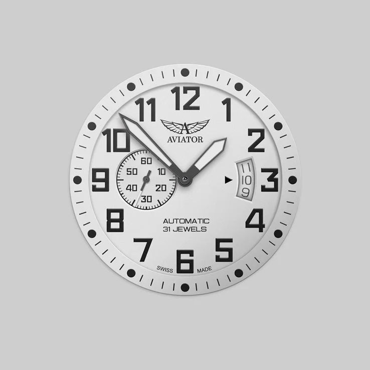 Utilizing the design of early cockpit clocks, the bold numerals and round indexes of the AVIATOR Bristol Scout have a look that is not only unique but also extremely legible. A small seconds hand located at 9 o'clock helps pilots ensure the watch is running accurately while the seconds run continuously.