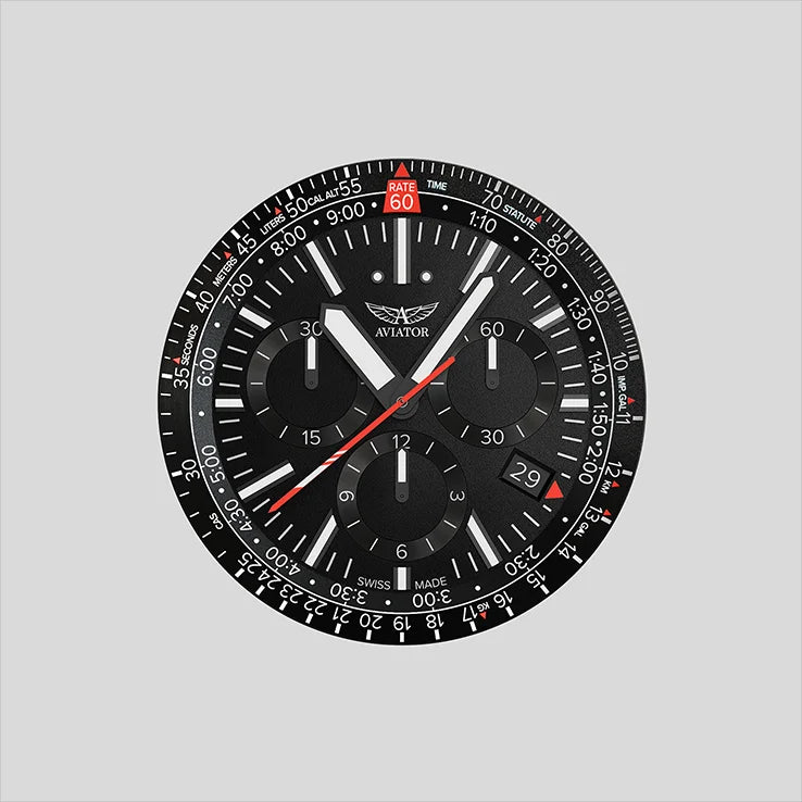 Inšpirovaný prístrojovým panelom MiG-29, s viacfunkčnosťou a rôznymi úpravami, ciferník vám umožňuje sledovať tri úrovne informácií: letecké posuvné pravítko na rotujúcom reflektore, čas a stopky s tromi chronografovými očami a centrálnu stop sekundovku. Jeho čisté indexy a výrazné ručičky ponúkajú jednoduchú čitateľnosť, zatiaľ čo línie posuvného pravítka a kruhy chronografu dodávajú vysokotechnologický pocit. Keďže každý ciferník AVIATOR je výsledkom veľmi presného inžinierstva a výrobných zručností, dostanete kvalitu na najvyššej úrovni, aká nemá obdobu.