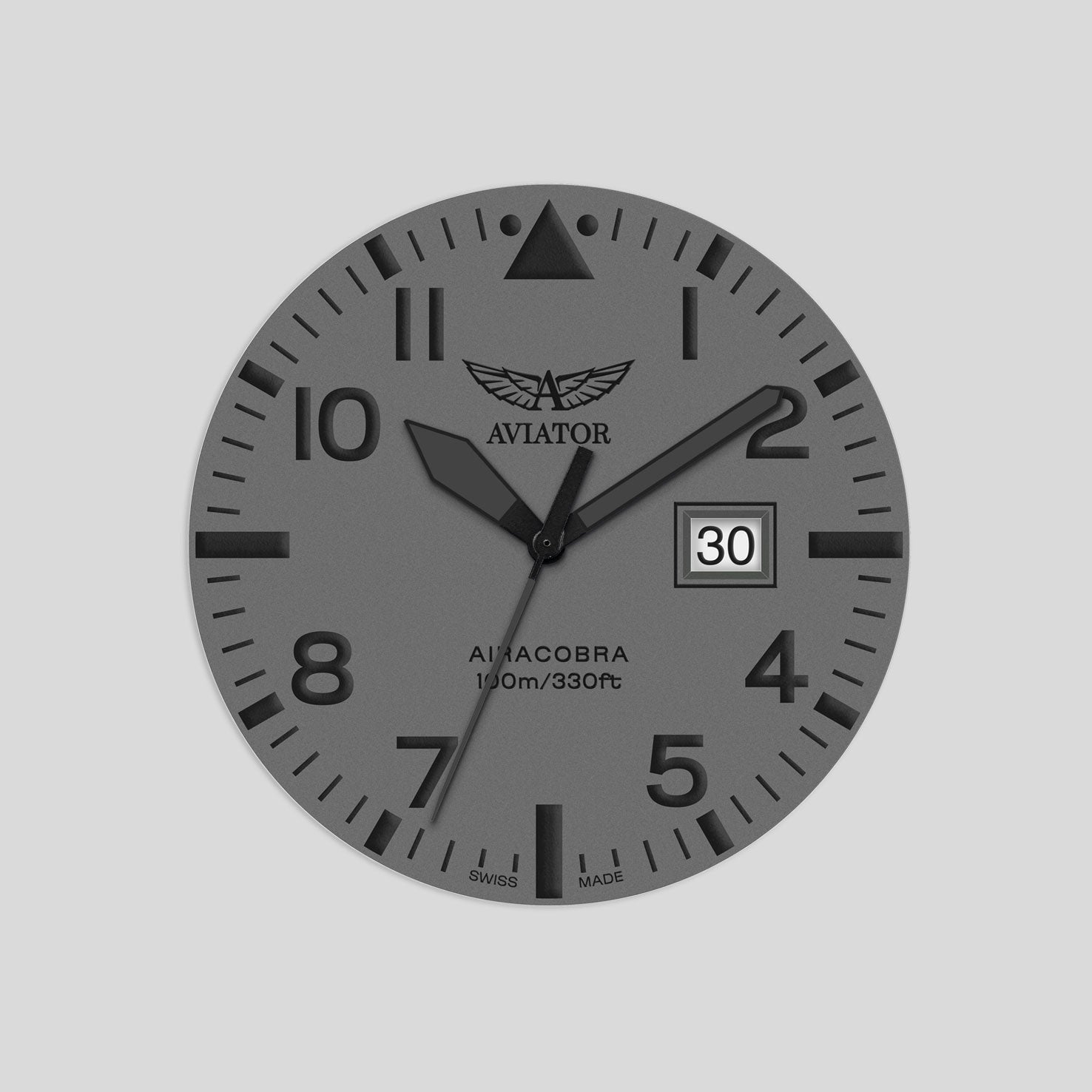 Ciferník, ktorý evokuje ducha kokpitu, je navrhnutý s matne zrnitou textúrou, ktorá týmto hodinkám dodáva inštrumentálnejšiu pocit. Jeho minimalistické, vysoko kontrastné ručičky a číslice poskytujú vynikajúcu jasnosť a čitateľnosť, zatiaľ čo nadrozmerné okienko kalendára v pozícii tretej hodiny zvyšuje jeho jedinečný dizajn. každý detail je premyslený tak, aby spájal autentickosť so vzhľadom inšpirovaným letectvom.