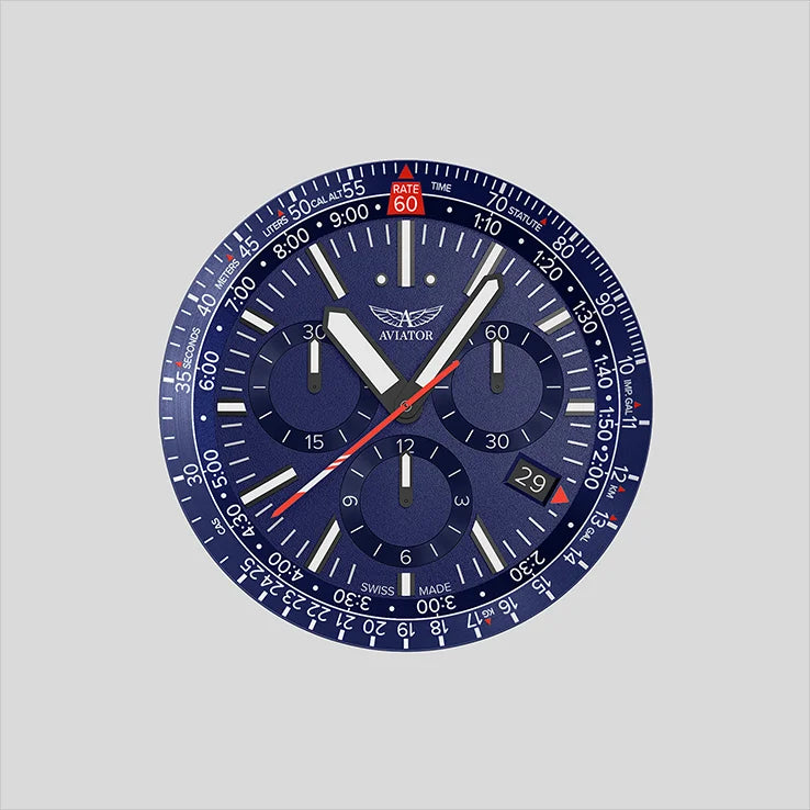 Inšpirovaný prístrojovým panelom MiG-29, s viacfunkčnosťou a rôznymi úpravami, ciferník vám umožňuje sledovať tri úrovne informácií: letecké posuvné pravítko na rotujúcom reflektore, čas a stopky s tromi chronografovými očami a centrálnu stop sekundovku. Jeho čisté indexy a výrazné ručičky ponúkajú jednoduchú čitateľnosť, zatiaľ čo línie posuvného pravítka a kruhy chronografu dodávajú vysokotechnologický pocit. Keďže každý ciferník AVIATOR je výsledkom veľmi presného inžinierstva a výrobných zručností, dostanete kvalitu na najvyššej úrovni, aká nemá obdobu.